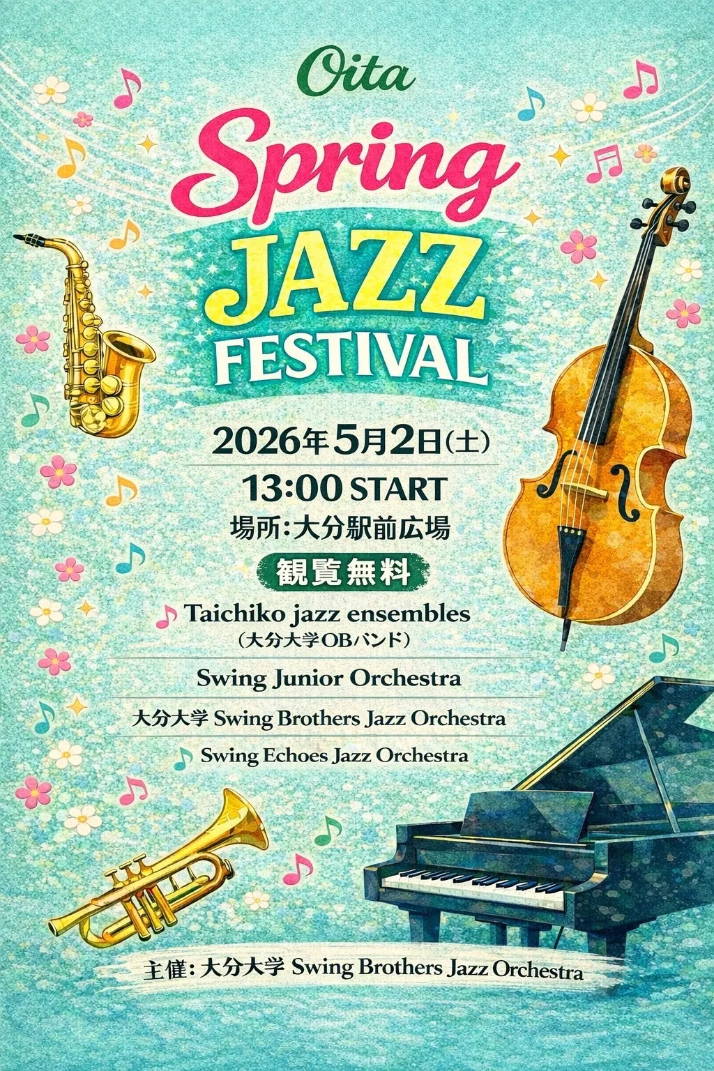 5月2日(土)大分駅前でビッグバンド「スウィングエコーズ・ジャズオーケストラ」が16時からアトラクションします。無料ですのでお気軽に。16時から5月15日(金)ボーカル上西千波ライブにドラムで参加し…